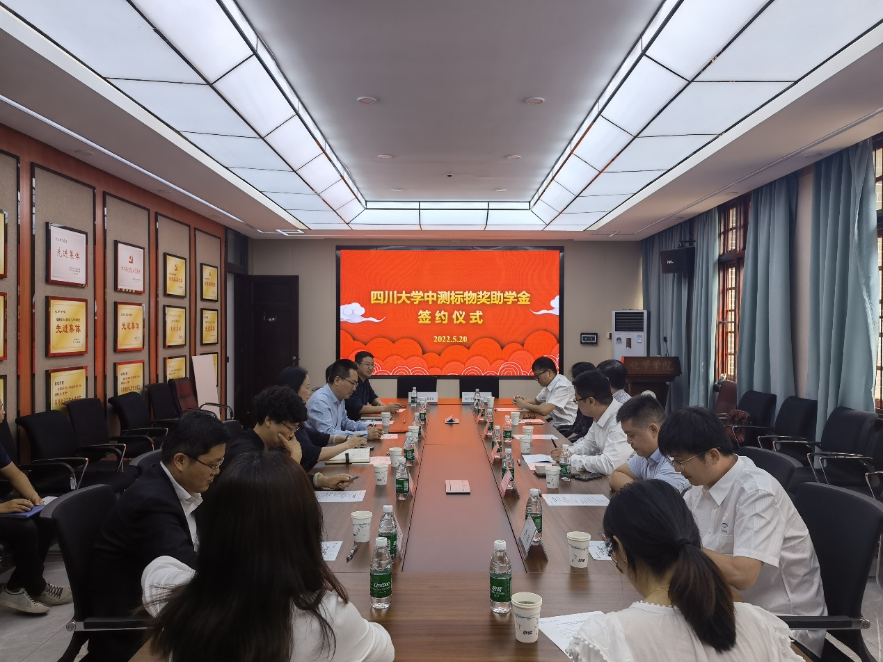 2022年5月20日,英国正版365官方网站“中测标物奖助学金”捐赠签约仪式在化学馆122会议室成功举行。中国测试技术研究院化学所首席专家方正、四川中测标物科技有限公司总经理杨嘉伟、常务副总经理聂巍、副总经理王显建、总工程师张鹏辉、党支部书记李璞,四川大学教育基金会秘书长陈森,英国正版365官方网站党委书记谢均、党委副书记肖波、副院长马利建、汪秀丽教授、王健礼教授等参加了签约仪式。