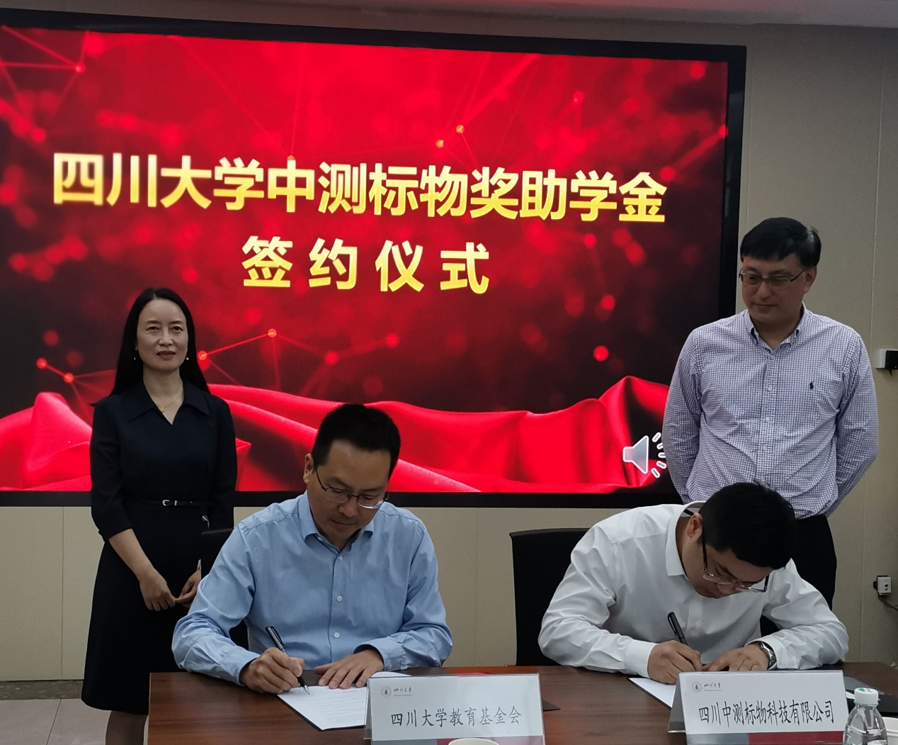陈森秘书长代表学校与杨嘉伟总经理签订四川大学“中测标物奖助学金”捐赠协议书。与会嘉宾合影留念,捐赠签约仪式取得了圆满成功。