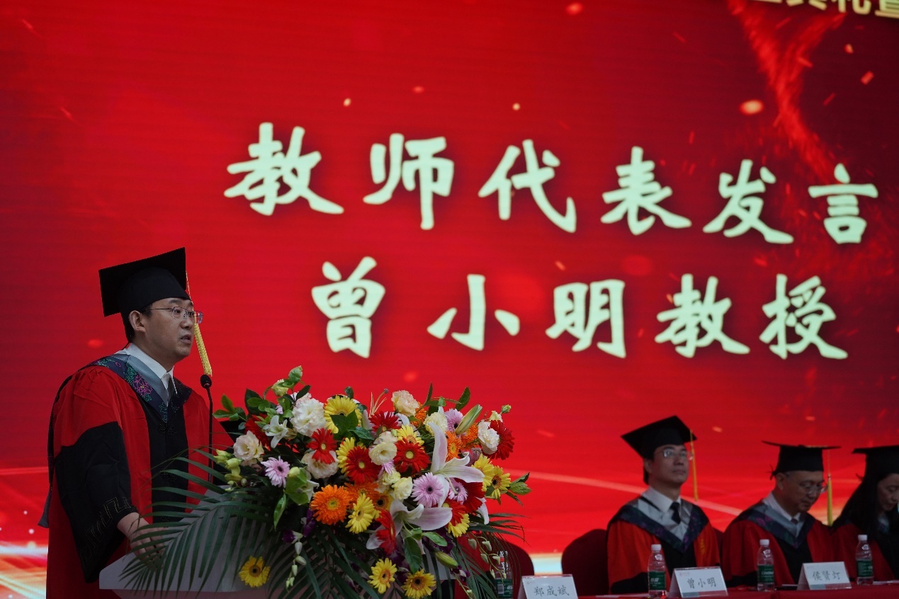 曾小明教授作为教师代表发言,希望全体毕业生在人生的各个阶段一定要怀揣努力奋斗之心,助人为乐之心,以及感恩之心。并祝愿同学们秉承“海纳百川,有容乃大”的校训,志存高远,脚踏实地,努力在自己的行业和领域里做出成绩。