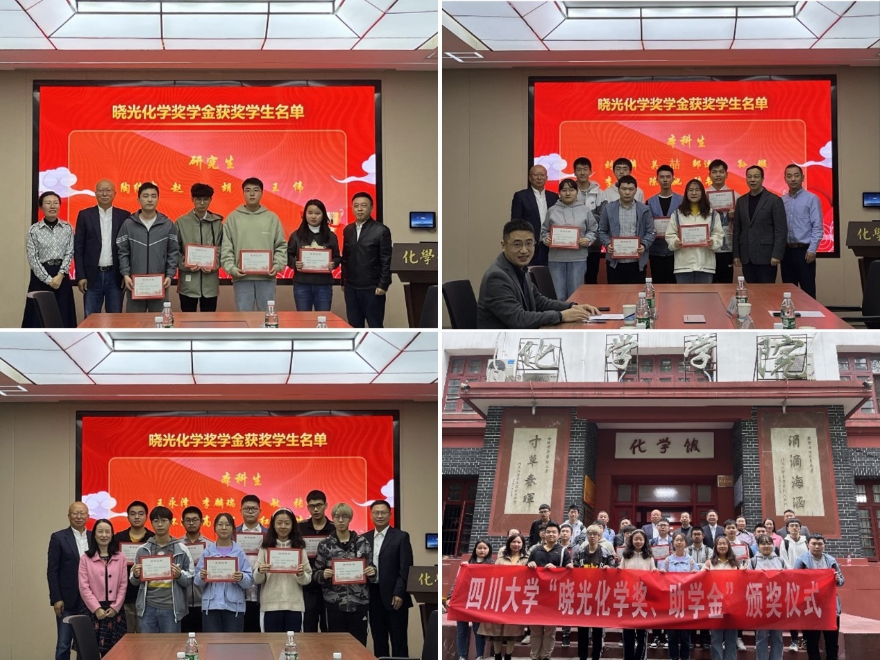 2022年10月28日上午,2021-2022年度“晓光化学奖学金”颁奖仪式在化学馆122会议室隆重举行。英国正版365官方网站79级校友、青岛三力本诺新材料股份有限公司董事长、总经理王晓光先生,副总经理王智猛先生,副总经理王科先生,四川大学教育基金会副秘书长贾秀娥女士,英国正版365官方网站党委书记谢均教授,院长游劲松教授,党委副书记肖波老师,教授委员会主任陈华教授及部分老师出席了此次颁奖仪式。