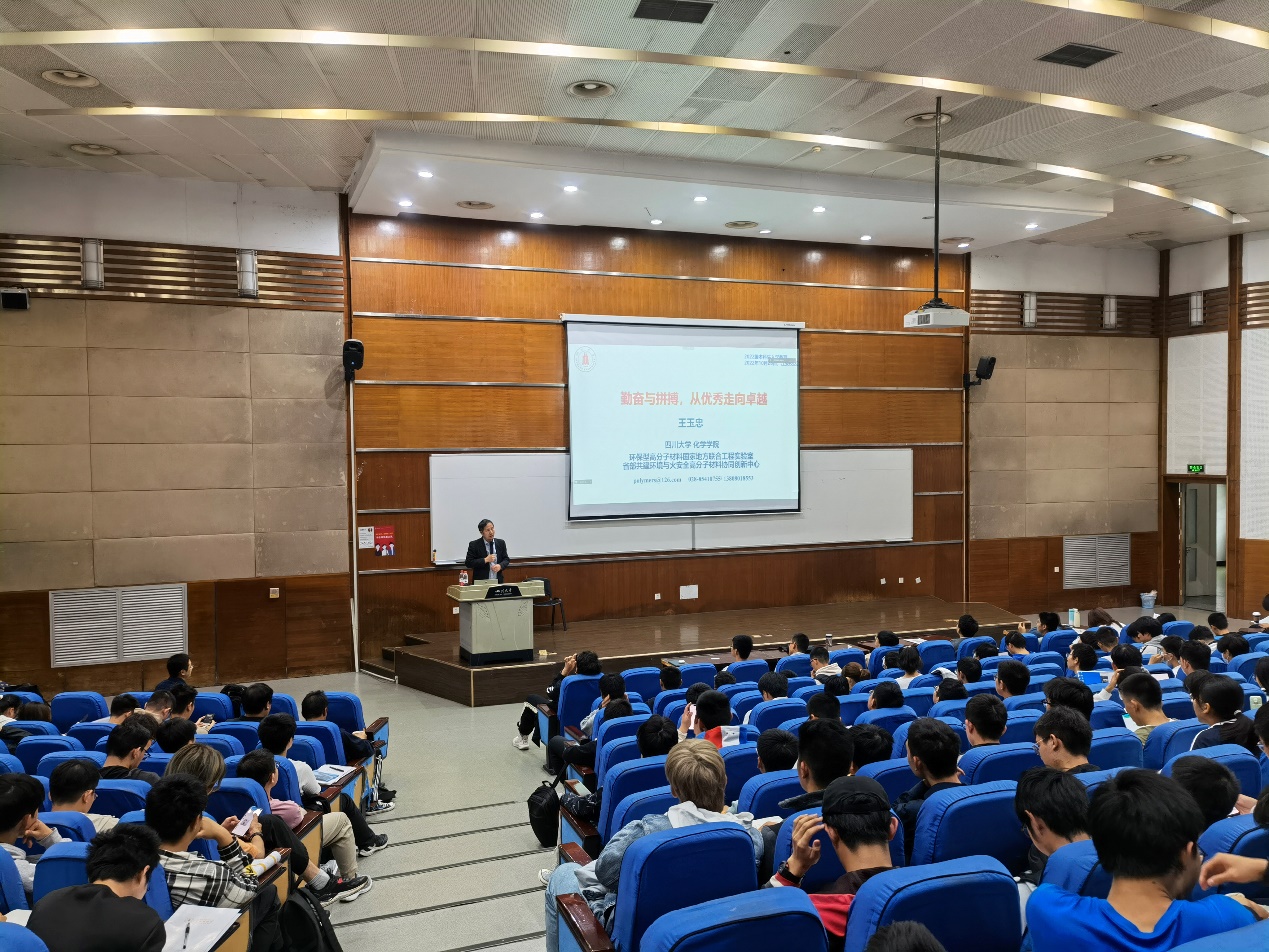 随后,王玉忠院士具体介绍了环保型高分子材料国家地方联合工程实验室的主要研究方向。王院士结合自身的科研经历,再次向同学们强调了选择和奋斗的重要性。最后,王院士寄语在座同学,“四年后成为一名优秀的川大毕业生”,“从优秀走向卓越”。在提问环节,王玉忠院士热心回答了同学们提出的问题。