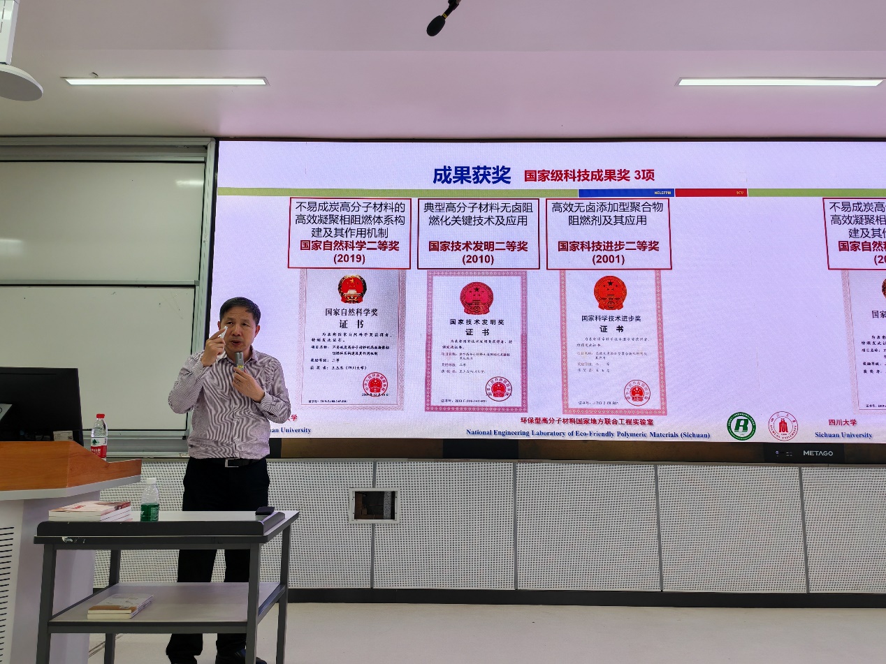 王老师指出了选择与奋斗的同等重要性,并饱含深情介绍了自己的选择与奋斗,讲述选择高分子、扎根高分子的心路历程,阐述高分子与现代社会的密切关系,高分子研究领域的广阔前景。科普了阻燃、高分子材料阻燃剂、火灾发生与高分子前沿领域的相关专业知识,在高分子领域取得的丰硕成果,介绍了FBR实验室的学生培养,研究团队以及科研条件。