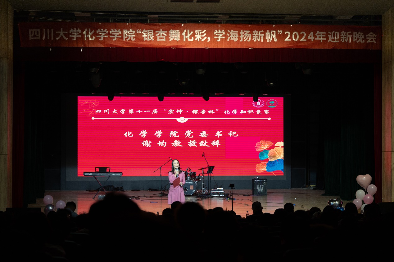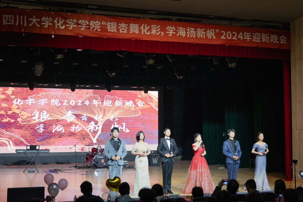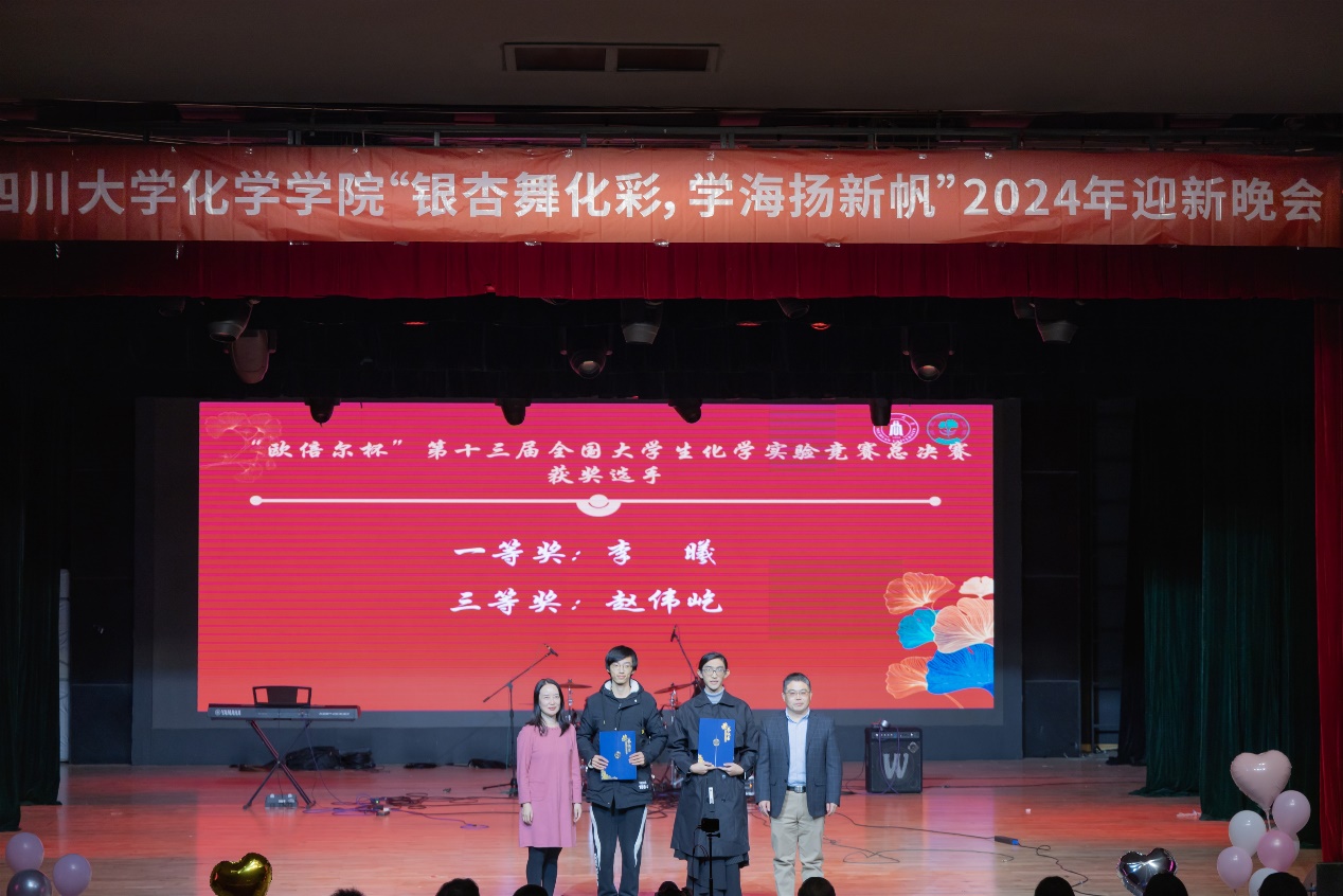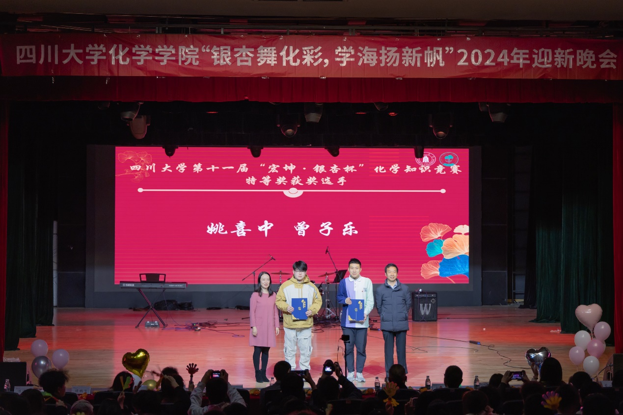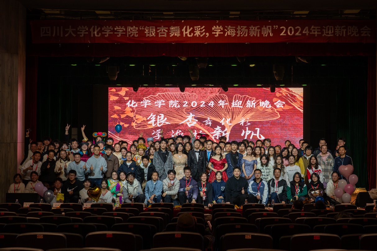为帮助2024级新生尽快融入大学生活,展示新时代青年风貌,加强美育教育,引导学生团结合作、积极向上,英国正版365官方网站“银杏舞化彩,学海扬新帆”2024年迎新晚会暨化学学科系列竞赛颁奖典礼于2024年12月1日晚19:00在江安校区艺术学院小剧场顺利举行。英国正版365官方网站党委书记谢均教授、党委副书记肖波老师、王玉良教授、郑保战教授、教导员王毅老师、学院全体辅导员、获奖选手及英国正版365官方网站2024级全体同学参加了本次活动。