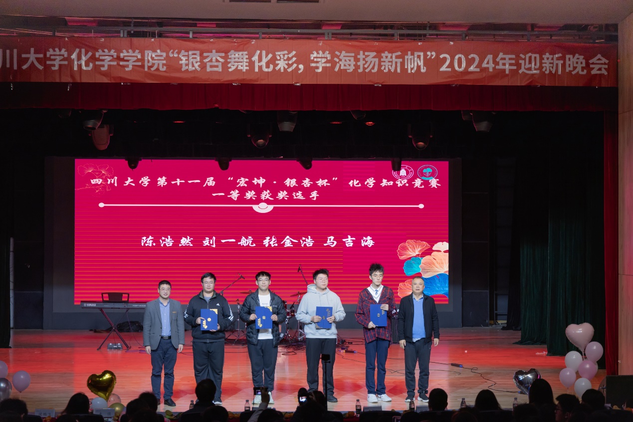 晚会在贺梓航同学和李默存同学的DJ打碟和吉他独奏热场表演中拉开序幕。首先谢均教授致辞祝贺获奖选手,鼓励同学们保持热爱,加强交流,书写积极向上的人生。随后,肖波老师宣读四川大学第十一届“宏坤•银杏杯”化学知识竞赛和“欧倍尔杯”第十三届全国大学生化学实验竞赛总决赛的获奖名单,颁奖嘉宾为获奖选手颁奖并合影留念。