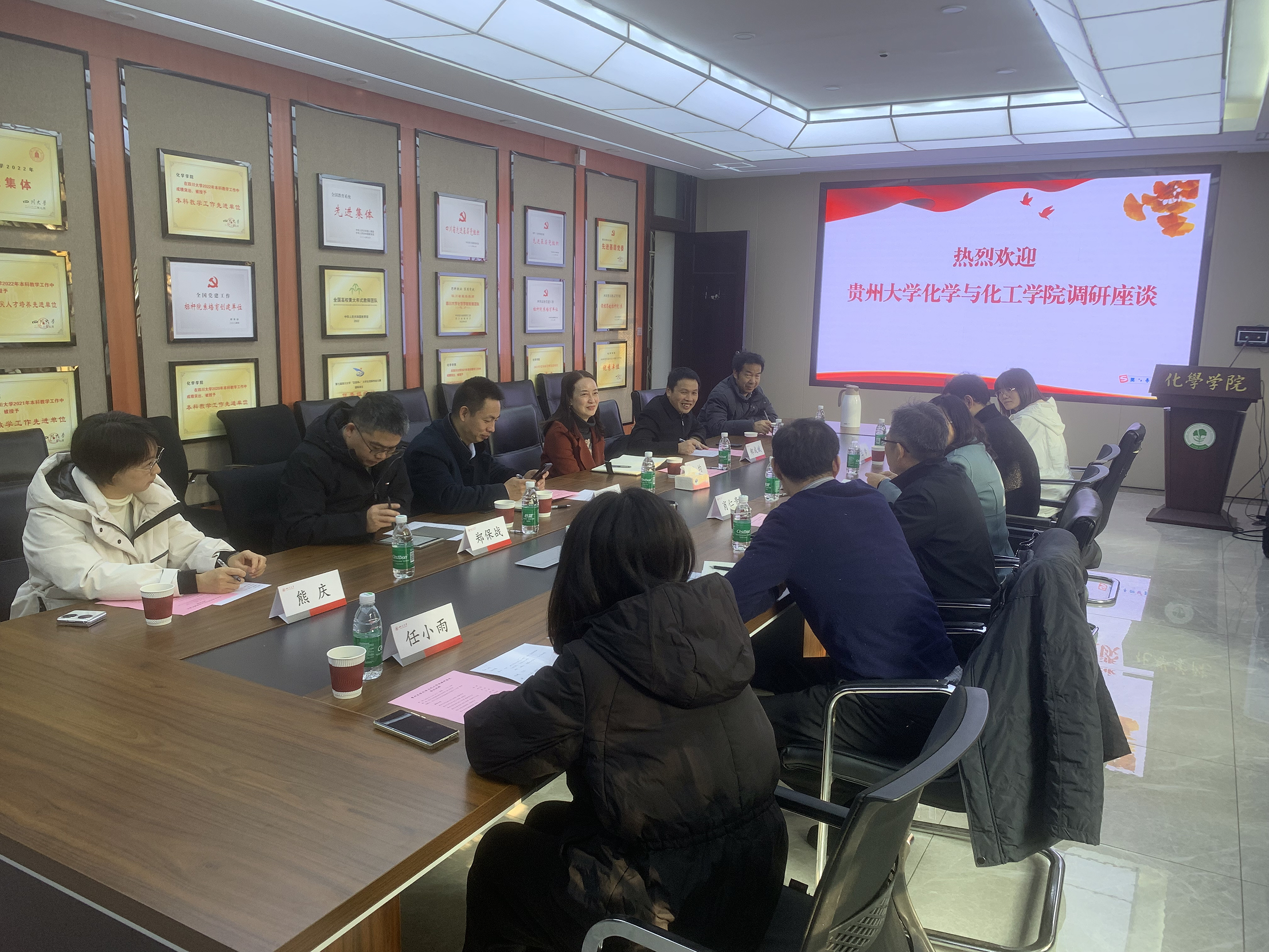 2024年12月17日,贵州大学化学与化工学院党委书记杨静教授、副院长肖仁贵教授、教研室主任吴松教授、实验中心主任王梦教授来我院进行调研交流。英国正版365官方网站党委书记谢均教授、四川大学发展规划处处长郑成斌教授、英国正版365官方网站副院长兼实验中心主任李坤教授、实验中心副主任郑保战教授、校教学督导专家王玉良教授及部分教师参加了交流座谈。交流会由李坤教授主持。