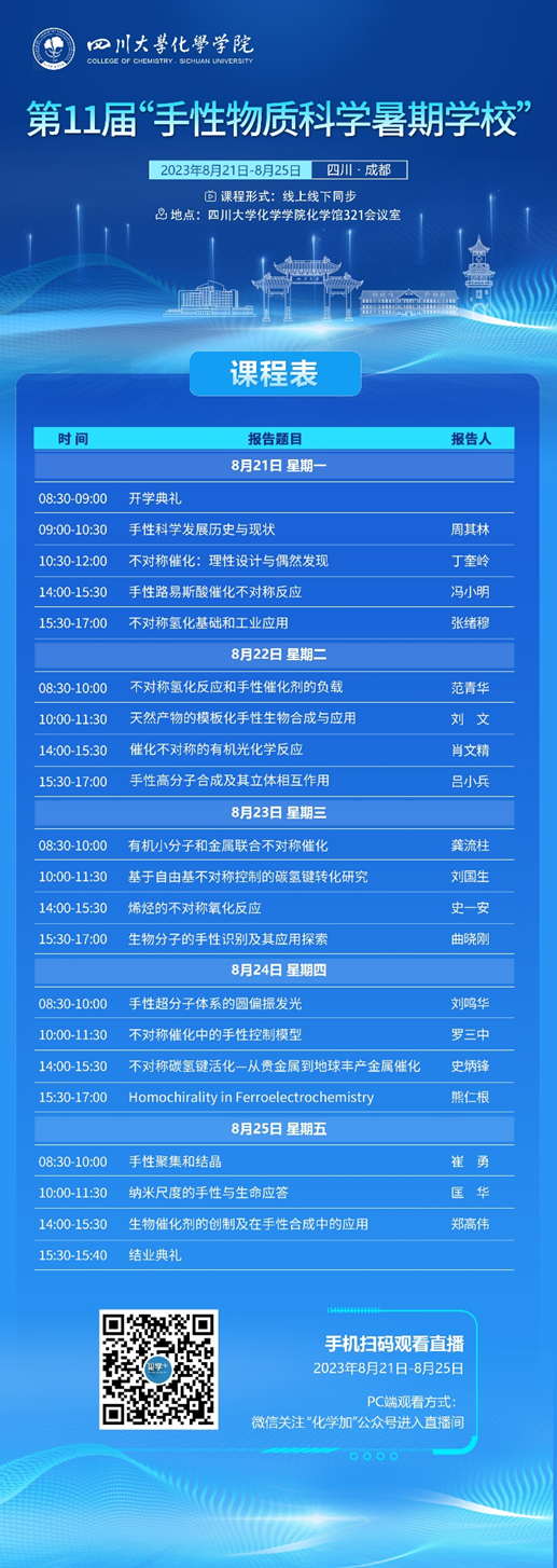 第十一届“手性物质科学暑期学校”由英国正版365官方网站、绿色化学与技术教育部重点实验室和“烃类不对称催化转化”基础科学中心承办,将于2023年8月21日-8月25日在四川大学望江校区举行(8月20日报到、26日离会)。此次暑期学校邀请了包括3位中国科学院院士在内的19位学术水平高、教学经验丰富的专家授课。