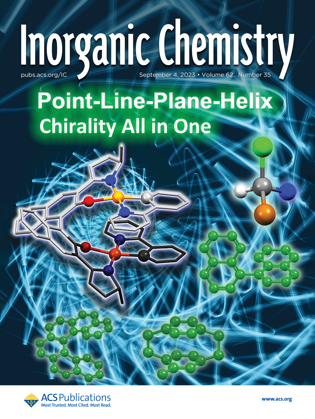 1. 构建首例“点线面螺”全手性分子:W. Y. Yun, L. Qu, B. Zhang, Q. P. Yang, J. T. Song, X. G. Zhou, H. F. Xiang,* ““Point-line-plane-helix” binuclear platinum(II) complexes: metal-induced chirality, chirality self-sorting, and chiroptical properties”, Inorg. Chem. 2023, 62, 14152 (封面).