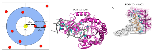 提出Pbase(RNA 碱基埋藏面积占 RNA 总结合面积的比例)参数将不同的蛋白质-RNA复合物聚为三类(RSC Adv, 2018, 8, 10582-10592);提出一种基于弹性距离阈值来定义RNA结合残基的新方法,称为两倍最小距离法2dmin (J Comput Aid Mol Des, 2018, 32, 1363-1373)。该方法考虑复合物之间的个体差异来确定不同复合物的距离阈值,并以此利用随机森林算法构建RNA结合位点预测模型,其预测准确率达90%。