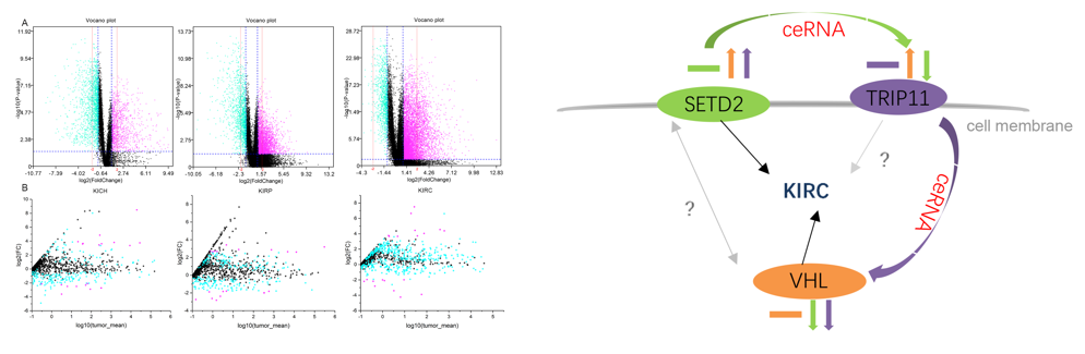 利用分子网络技术,实施基于miRNA的肾癌分子分型研究(Brief Bioinform, 2020, 1, 73-84 )。构建miRNA关联的ceRNA-ceRNA 相互作用网络,分析三种肾癌亚型(KICH, KIRC和 KIRP)之间的差异图谱,筛选hub基因,考察它们在不同亚型中的作用机制。利用网络计算结合基因表达实验确认SETD2、TRIP11与VHL可作为对KIRC的分型标记。调控网络分析给出三个基因之间的相互调控关系。