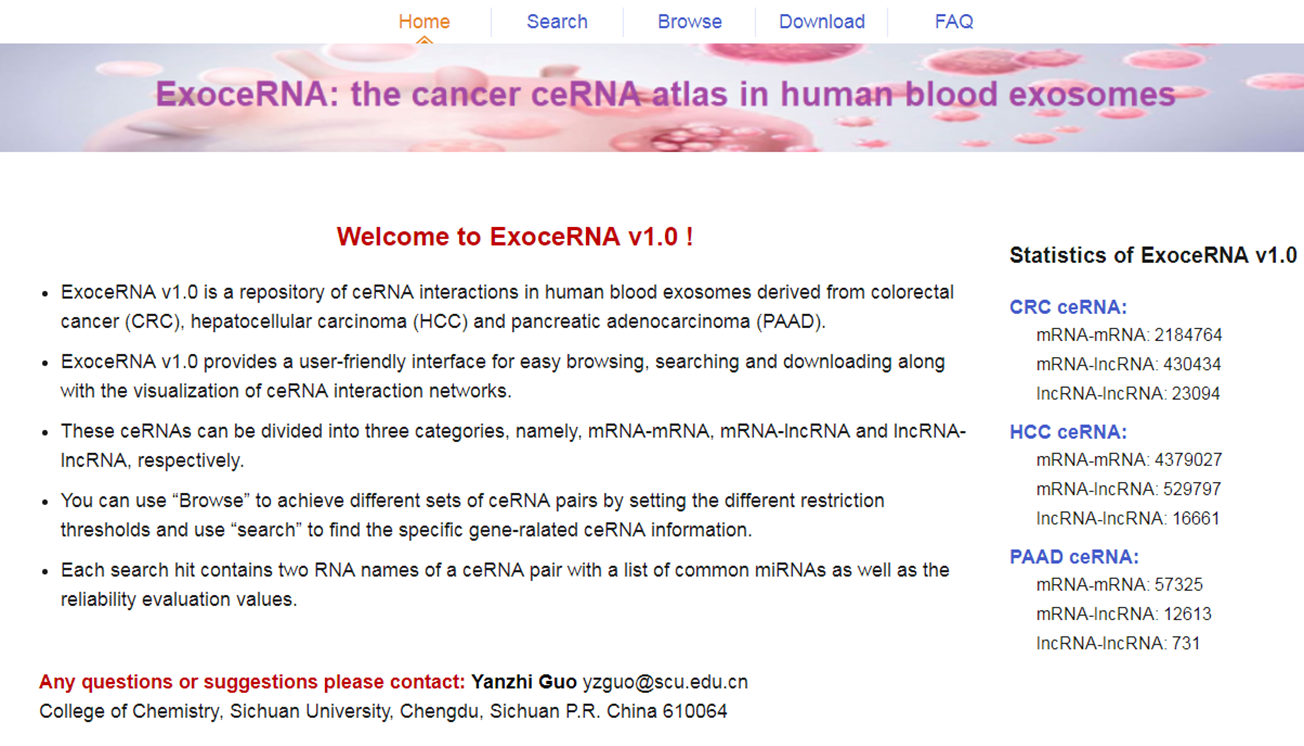 开发癌症血液外泌体的ceRNA网络数据库。针对三种癌症,包括结直肠癌(CRC),肝细胞癌(HCC)与胰腺癌(PAAD),利用超几何测试、网络拓扑分析及hub节点功能分析,获取百万级ceRNA相互作用对。数据库名为ExoceRNA Atlas (https://www.exocerna-atlas.com/exoceRNA)。网站首页如下图所示。
