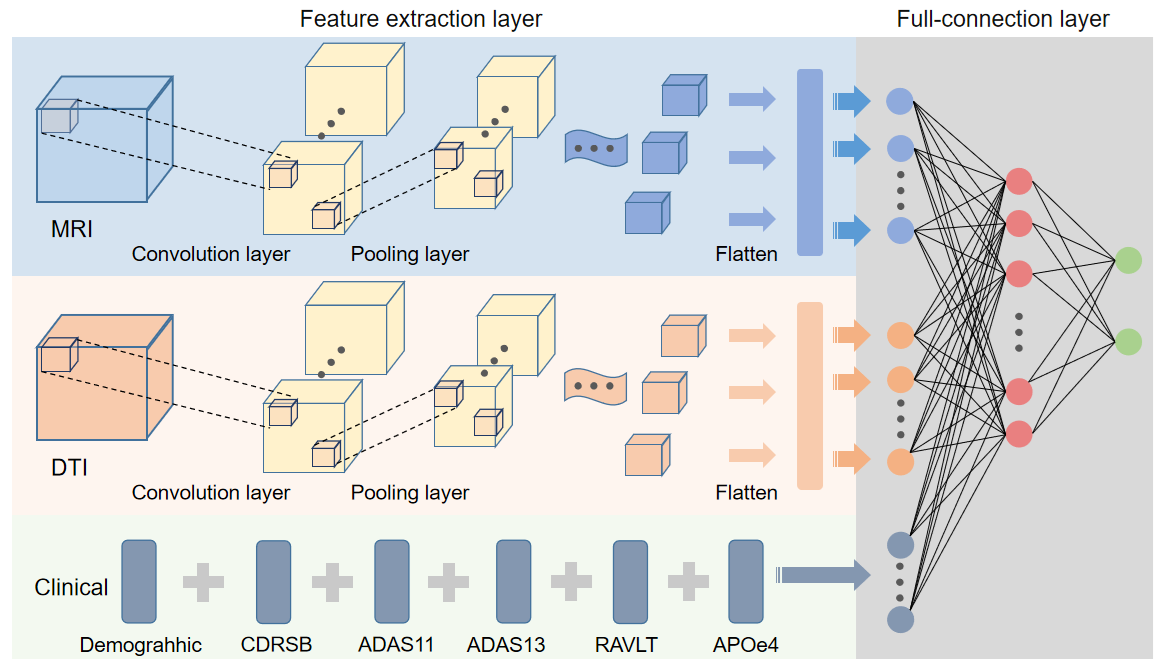 (4)利用深度学习算法开展基于生物序列及医学图像数据的疾病诊断模型构建。 我们开发了基于卷积神经网络与长短时双向记忆相结合的深度学习模型,对白血病四个亚型TF的7万多个DNA结合位点进行预测 (Chemometr Intell Lab, 2020, 199, 103976 )。轻度认知功能障碍(MCI)作为阿尔茨海默病(AD)的预兆,具有相对复杂多变的特点。针对早、晚期MCI的诊断问题,利用多模态影像学数据核磁共振图像(MRI)和扩散张量图像(DTI)特征,融合临床诊断特征数据,提出了基于3D卷积神经网络的诊断模型,其预测准确率达97.2%,AUC为0.995(Wang C, Pu XM, Guo YZ* et al. A new deep convolutional neural network model for effective prediction of mild cognitive impairment,审稿中)。