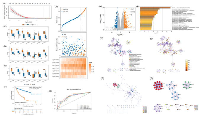 (3)利用生物多组学数据分析提取分子特征,结合病人临床数据与机器学习算法实现对不同癌症的风险预测。 DNA基因甲基化位点的变化能调控基因的表达,通过分析差异性甲基化位点与差异性基因mRNA、lncRNA及miRNA之间的关系,计算筛选7个DNA甲基化位点,并利用LASSO-Cox算法实现对KIRC肾癌患者的风险模型构建 (Life Sci, 2020, 243, 117289)。利用加权基因共表达网络(WGCNA)方法,在系统水平上研究甲状腺癌发病机制中的基因网络特征,将临床特征与基因网络模块结合筛选得到6个病理分期标记基因,图18所示,以此构建晚期患者预后预测模型(Xu Li, Li ML, Guo YZ* et al. Identification of pathological stage-related genes of papillary thyroid cancer along with survival prediction, 审稿中)。