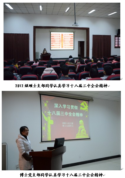 党的十八届三中全会召开以来,英国正版365官方网站各个支部积极组织全体党员同学认真学习十八届三中全会会议精神,同时成立了“中国特色社会主义理论研究分会”学习小组,围绕《中共中央关于全面深化改革若干重大问题的决定》、习近平总书记一系列讲话等内容,对全体党员同学进行宣讲辅导,力求全面深入地宣传党的十八届三中全会精神,引导学生深刻领会、准确把握党的十八届三中全会的精神实质。