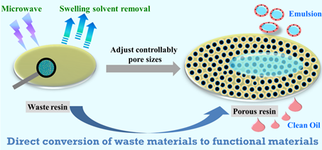 到目前为止,人类已经产生63亿吨塑料垃圾,绝大部分被填埋、焚烧或排入海洋,对自然环境造成严重的污染。其中热固性塑料由于其稳定的三维网状结构,不熔不溶,更不能在自然环境中降解,给循环利用造成极大困难。寻求一种绿色、节能、高附加值的回收方式是塑料回收领域的一大挑战。王玉忠院士团队采用以废治废的设计理念,发现利用微波极化作用和调节溶剂极性和溶解度参数可实现在热固性树脂中快速成孔,提出了微波溶胀可控致孔新方法,通过简单的物理改性法将废旧的热固性树脂成功制备成一种孔径可调的油水分离材料(图1)。该方法不仅为热固性塑料回收利用提供了一种新的理念,而且为油水分离材料的设计提供了一种新的思路。