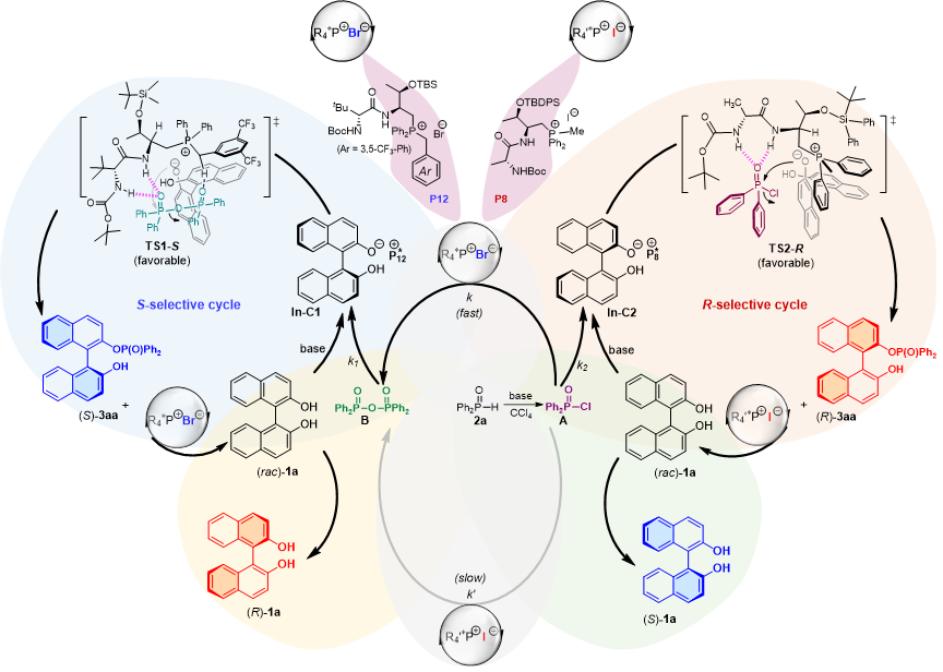 我院王天利教授课题组一直致力于手性肽-季鏻盐催化的不对称合成化学研究,开发了一系列新型高效的多功能手性肽-季鏻盐催化剂、及其催化的新合成方法学。针对上述科学挑战,该团队利用二肽-季鏻盐作为手性催化剂,通过对催化剂骨架尤其是对催化剂负离子的微调,发展了季鏻盐调控识别A-T反应体系中不同亲电磷中间体的新策略,首次实现A-T反应介导的轴手性二酚及氨基酚类化合物的立体发散型不对称拆分。机理研究表明:催化剂季鏻盐调控了氧磷化合物P(O)-H经A-T历程生成不同的主要磷活性中间体A(磷酰氯)和B(磷酸酐),这两类主要中间体被季鏻盐识别后进入不同的催化循环实现不同的立体选择性拆分反应(S-selective cycle 和R-selective cycle),由此获得构型相反的拆分产物和底物,并释放出催化剂进入下一个催化循环。
