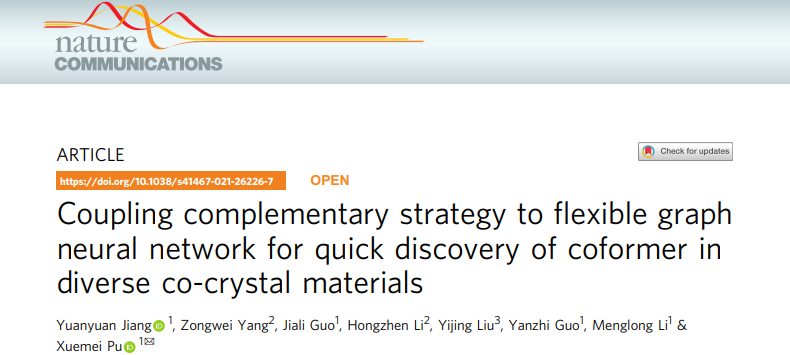 近日,英国正版365官方网站--化学与生物信息学实验室蒲雪梅教授在Nature Communications杂志上在线发表了论文:Coupling complementary strategy to flexible graph neural network for quick discovery of coformer in diverse co-crystal materials,开发了一种普适性强准确度高的深度机器学习的共晶筛选模型,该模型可灵活应用于多种领域的共晶预测(药物、有机功能以及含能材料等),大幅提升了机器学习对共晶虚拟筛选的泛化能力和准确度,其构建策略可为深度学习在其它领域的应用提供了参考和指导。