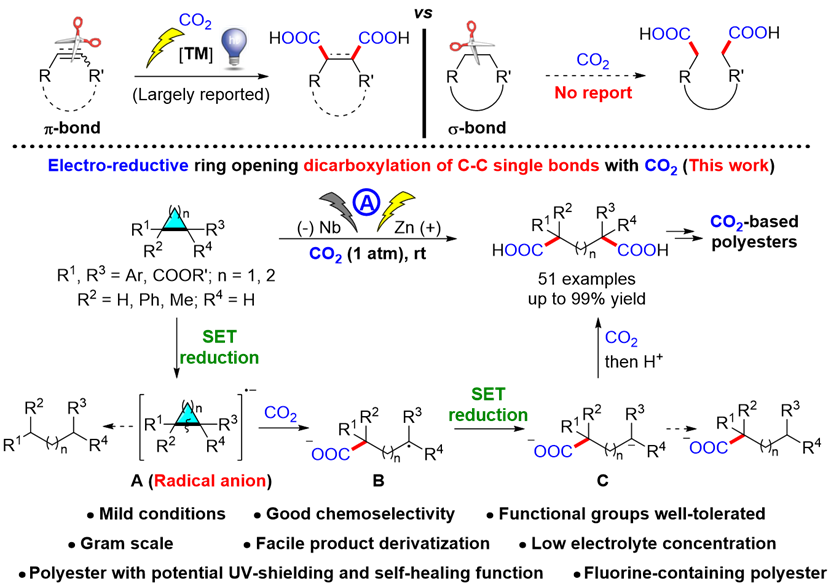 总的来说,该研究利用温室气体CO2作为羧基源,通过电化学发展了一种张力环化合物碳-碳单键的双羧基化新方法,实现了戊二酸和己二酸类化合物的高效高选择性合成,为重要二酸化合物的制备提供了新途径,为新型高分子材料的开发奠定了物质基础。