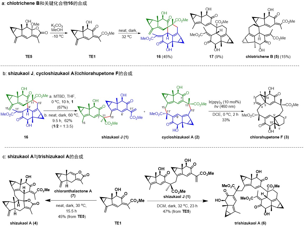 四川大学刘波教授课题组自2008年起,持续开展乌药烷倍半萜化合物的合成研究,已经实现了多个该类天然产物的全合成。最近,他们以被广泛接受但尚未证实的TE1为关键的生源中间体实现了六个乌药烷天然产物的全合成(图1),验证了生源合成途径。该合成工作首先以TE1为中间体通过自身Diels-Alder反应,高立体选择性地实现了头碰头型[4+2] 二聚体chlotrichene B 的全合成,以及获得了关键化合物16(图1a),该中间体可以通过骨架重排生成异源二聚体shizukaol J以及十二元环二聚体cycloshizukaol A。Cycloshizukaol A可在光照下发生乙烯基环丙烷的骨架重排,后续衍生为天然产物chlorahupentone F(图1b)。除此之外,三烯中间体TE1可与乌药烷倍半萜单体chloranthalactone A 以及二聚体shizukaol J 分别发生二聚化反应得到背靠背型 [4+2]二聚体shizukaol A以及三聚体trishizukaol A(图1c)。