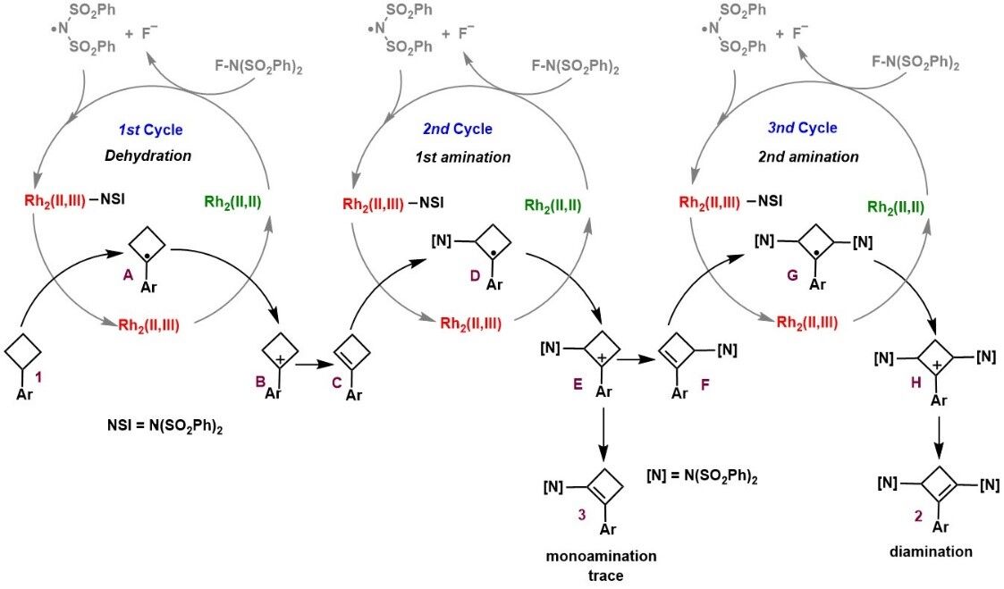 为实现环丁烷的二胺化反应,王元桦课题组通过近些年来发展的双核铑催化的单电子氧化反应,利用市售的N-氟代苯磺酰亚胺 (NFSI)作为氧化剂和非氮宾氮源,成功地在30分钟内实现了芳基环丁烷的C-2,4位的二胺化反应,最高收率可达86%。