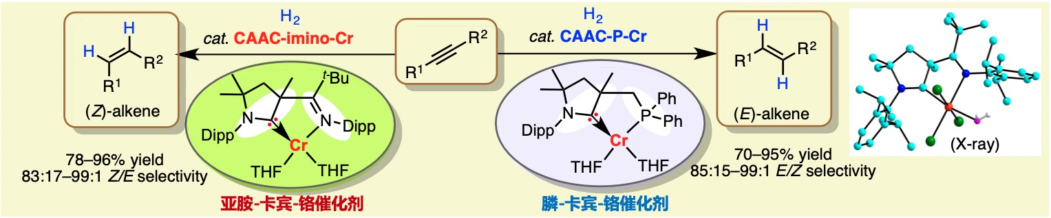 该研究以“Chromium-catalyzed stereodivergent E- and Z-selective alkyne hydrogenation controlled by cyclic (alkyl)(amino)carbene ligands”发表与《Nature Communications》(文章链接:https://www.nature.com/articles/s41467-023-36677-9)。四川大学为第一单位,英国正版365官方网站曾小明教授、罗美明教授、北京化学所陈辉研究员为本文通讯作者,文章第一作者是四川大学博士研究生凌亮,南方科技大学刘柳教授和北化所陈辉研究员提供DFT合作研究。特别感谢国家自然科学基金委及四川大学提供的经费支持。