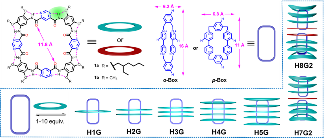近日,我院袁立华教授课题组与杨成教授、深圳大学化学与环境工程学院李霄鹏教授合作, 利用含有嘧啶结构单元的氢键芳酰胺大环1a与阳离子环番客体(o-Box/p-Box)成功构筑了一类结构新颖的环套环组装体H4G和H5G及其高阶离散型二聚体H7G2和H8G2。在对环套环主客体复合物的单晶进行解析时,作者发现大环1a骨架发生了一系列连续变化的构象适应特征。此外,阳离子环番客体(p-Box)在H5G中客体表现为与H4G中不同的构象,表明在环套环主客体复合物中,客体也具有一定的构象适应性。环套环体系的构象适应性与整个超分子结构的稳定化有关,而后者取决于体系中多重非共价作用的协同结果。根据此现象,通过控制大环的当量,该团队成功构筑了由七个或八个大环1a与两个o-Box/p-Box组成的高阶复合物,即H7G2和H8G2。在离散型环套环二聚体晶体结构中,多个大环通过调整自身构象以使分子间相互作用力达到最大,以确保H7G2/H8G2型二聚复合物的形成,有效避免了超分子聚合物的形成。这与H4G/H5G中观察到o-Box呈现的两种不同构象相互呼应,表明环套环体系中的构象适应性可以由主、客体双方互相诱导而产生。该研究结果展现出二维氢键大环用于构筑高阶环套环组装体所具有的独特性,有助于理解高阶纳米组装体形成过程中涉及到的界面作用及构象适应性现象。