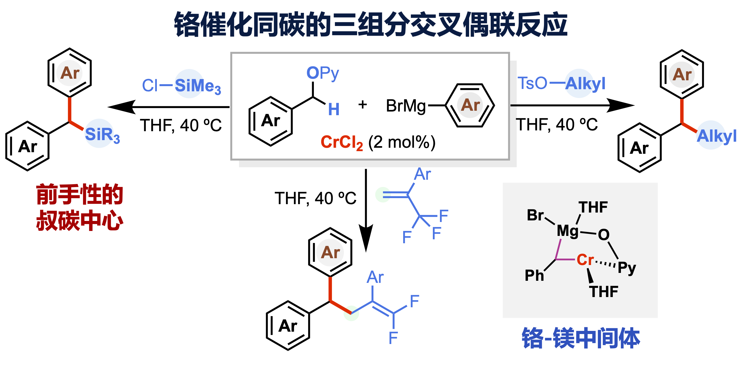 有机合成的核心任务是高效、高选择性地构筑重要功能化合物。传统的交叉偶联常涉及两组分反应一步生成一根化学键(one bond formation)。对应地,多组分交叉偶联可一步生成多根化学键,具有高效、快速及不用分离中间体的特点,但因其副反应较多,面临化学选择性挑战。值得注意的是,通过断裂同碳位置上两根不同的化学键,将其与亲电和亲核试剂同时偶联构筑前手性的叔碳化合物,仍缺乏有效的合成手段。由于这类前手性叔碳中心广泛于众多药物分子的结构单元中,发展策略来实现三组分底物在同碳位置的交叉偶联、一步高效构筑叔碳化合物具有重要研究意义。