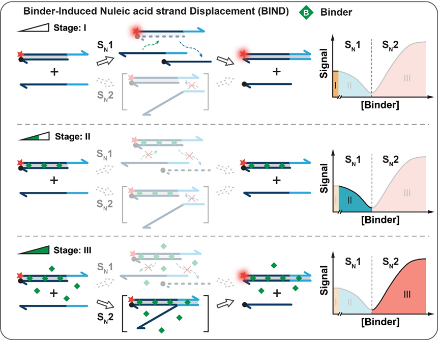 近日,我院李峰教授课题组以有机反应中亲核取代反应机理的视角,对该经典反应进行审视与重构:经典TMSD反应类似于SN2反应机理,而当环境中缺少金属阳离子时,链置换过程可与SN1路径类比。在此基础上,通过能够与DNA结合的小分子来代金属阳离子去实现链置换过程,并精准调节SN1和SN2反应路径。此类小分子通过插入或沟槽结合的方式与DNA的双螺旋结构结合,能够显著改变DNA的稳定性和功能,而且小分子与双链DNA(dsDNA)之间的相互作用是许多抗癌和抗感染药物的基础。本文中,首先验证了通过此类能够与DNA结合的小分子去介导链置换反应(Binder-Induced Nucleic acid strand Displacement, BIND)。结果显示,小分子与dsDNA的亲和力和其所带电荷能够精准控制链置换反应的路径。随后,进一步将这一全新链置换反应应用于DNA-小分子相互作用的系统、高通量表征,实现了结合常数(Kd)、结合位点大小(n)、协同性(ω)、焓(ΔH)和熵(−TΔS)的贡献以及序列选择性一系列特征参数的一站式综合分析。BIND还可以被设计成高通量筛选的工具,从大量化合物中筛选与DNA有特异性亲和作用的小分子化学物,并成功地从含有700个化合物的库中筛选出8个全新的DNA结合小分子。