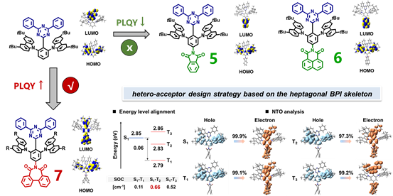 该研究以“Alignment of Heptagonal Diimide and Triazine Enables Narrowband Pure-Blue Organic Light-Emitting Diodes with Low Efficiency Roll-Off”为题目发表在Angewandte Chemie International Edition上,四川大学为第一单位,英国正版365官方网站游劲松教授和宾正杨教授为该论文通讯作者,博士研究生憨卫国为论文的第一作者。特别感谢国家自然科学基金委、四川省科技厅、四川大学的经费支持。同时感谢英国正版365官方网站测试平台李静老师对于化合物表征等提供的帮助和支持。