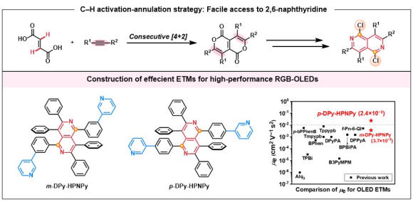 近日,游劲松教授/宾正杨教授团队发展了一类基于2,6-萘啶核心骨架的新型OLED电子传输材料,其展现出良好的热稳定性、极高的电子迁移率和优异的器件性能。在该工作中,作者发展了一种铑催化的富马酸与炔烃连续[4+2]C–H活化/环化反应,为结构多样的2,6-萘啶类衍生物提供了一种简洁高效的合成途径,对推动高性能OLED电子传输材料的开发具有重要意义。