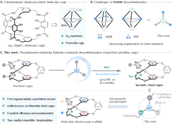 近日,我院王天利教授团队设计合成了一类结构柔性且高度可控可调的、具有二级螺旋结构的折叠体肽-季鏻盐催化剂。利用该有机折叠体催化剂,首次实现了潜手性有机分子笼的远程去对称化,精准构建了一系列结构丰富的手性分子笼化合物,为固有手性分子笼的催化不对称合成开辟了前所未有的途径(图1c)。