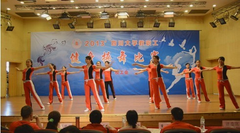 10月25日下午,学校工会在望江校区文华活动中心演播举行“四川大学2013年教职工健身操舞比赛”,全校各部门工会组织的39支参赛队共500余人参加了比赛。我院由12名老师组成的代表队经过半个多月辛苦排练,以动感的舞步,饱满的热情,展示了英国正版365官方网站教职工积极健康向上的精神风貌,赢得全场观众阵阵热烈的掌声,获得优秀奖。本套健身舞是由我校体育学院张晓波教授根据国际流行趋势,以健美操为基本元素,并吸纳当前多种时尚流行舞蹈元素创编而成,集活力与朝气、优雅与动感、传统与时尚于一身,动作简单但又颇具风格,有很强的健身性、普及型及观赏性。希望学院更多的老师能参与到各项文体活动中,快乐工作,健康生活。