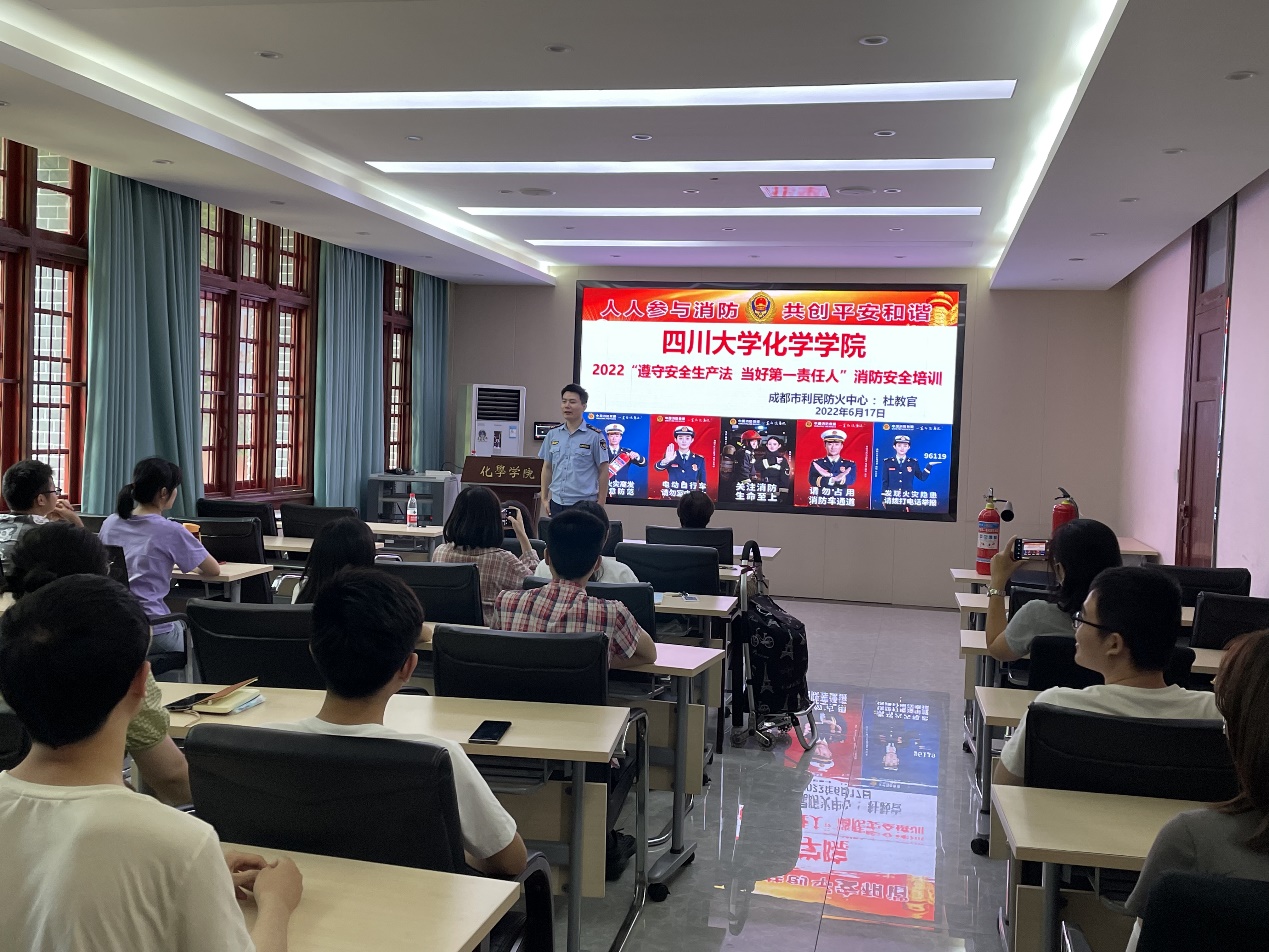 2022 年 6 月是第 21 个全国“安全生产月”, 6 月 16 日为全国安全宣传咨询日。为深入贯彻落实习近平总书记关于安全生产重要论述,增强全院师生消防安全意识,普及消防法规和安全知识,提高师生应急处理能力和逃生自救能力, 我院以“安全生产月”为契机,于2022年6月17日下午邀请成都市利民防火中心杜教官在化学馆112进行了“遵守安全生产法,当好第一责任人”为主题的消防安全培训。李坤副院长主持了培训会。