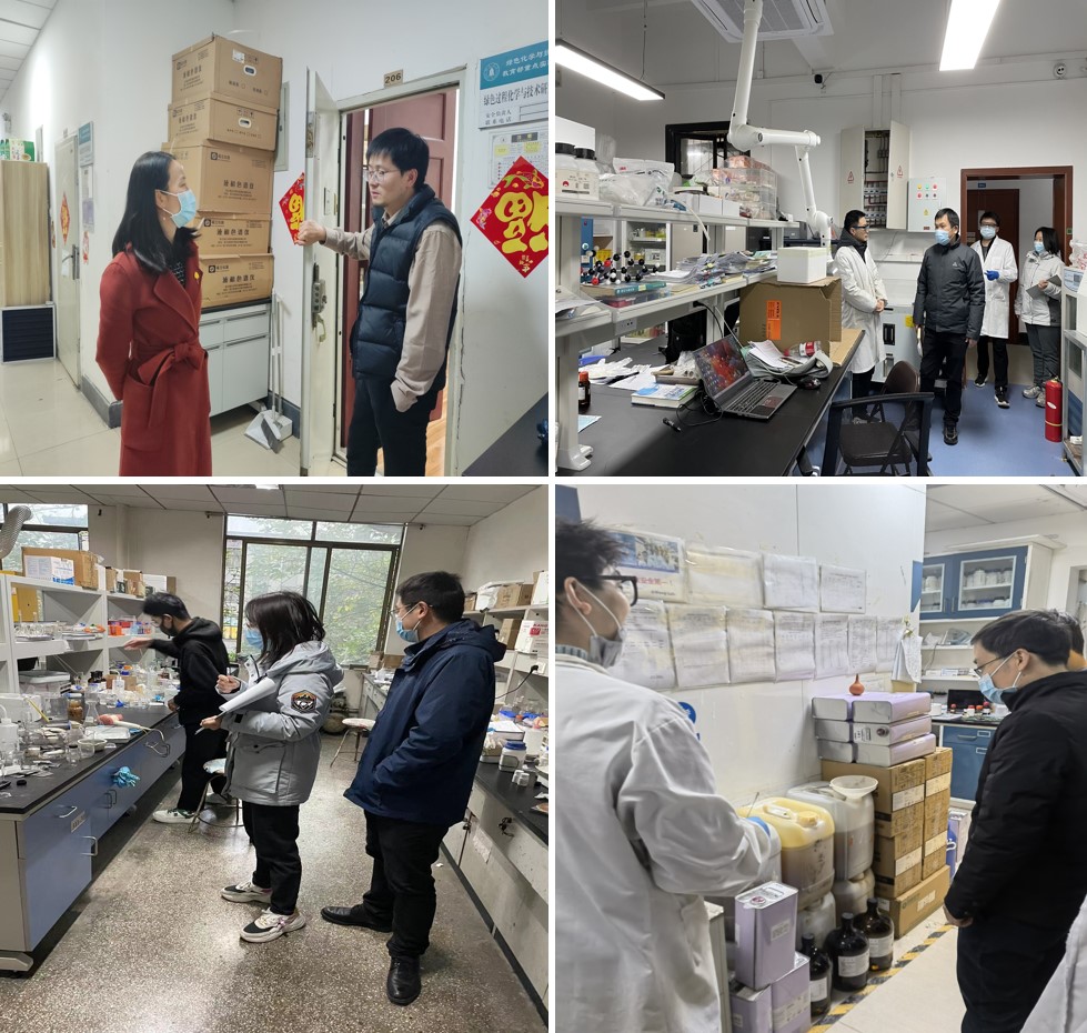 121日学院领导带队分成四个小组,对学院各实验室进行了节前安全大检查。谢均书记带队重点检查了化材楼B座和化学馆,肖波副书记带队重点检查了第一理科楼1-3层,郑成斌副院长带队检查了第一理科楼4-6层,马利建副院长带队重点检查放化馆和化材楼A座。本次安全大检查着重排查了消防安全、用电安全、危险化学品储存使用、气瓶管理和公共卫生等问题,并对检查中发现的安全隐患做了详细记录,要求相关课题组立即整改。