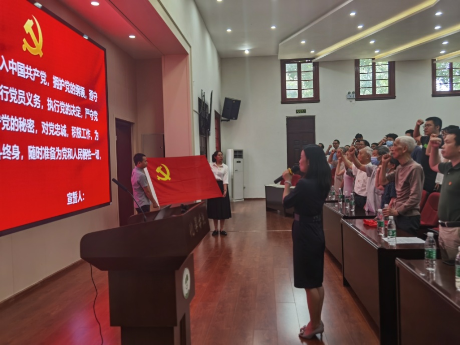 在庄严的中国共产党党旗下,由谢均同志领誓,全体新党员进行了宣誓仪式,全体正式党员重温入党誓词,表达了为党的事业奋斗终身的坚定信念。