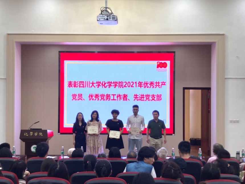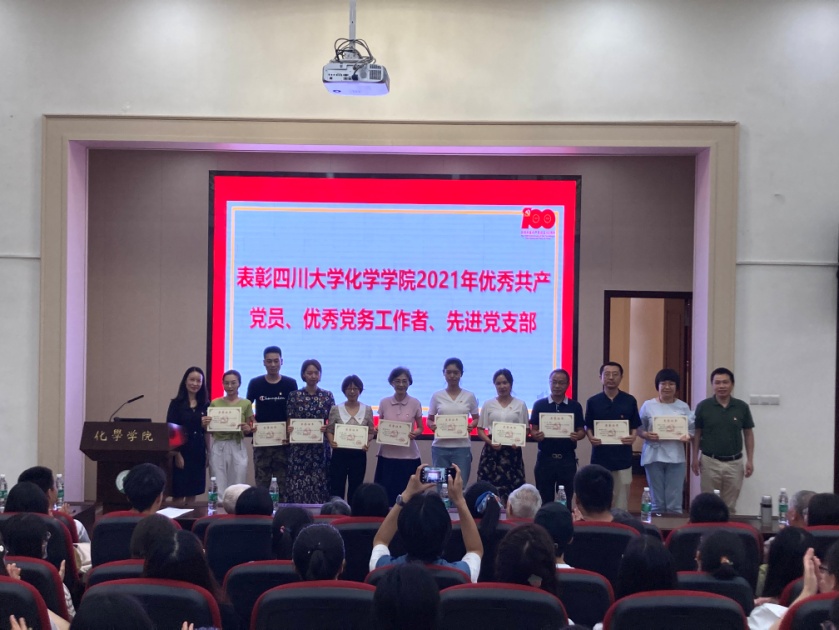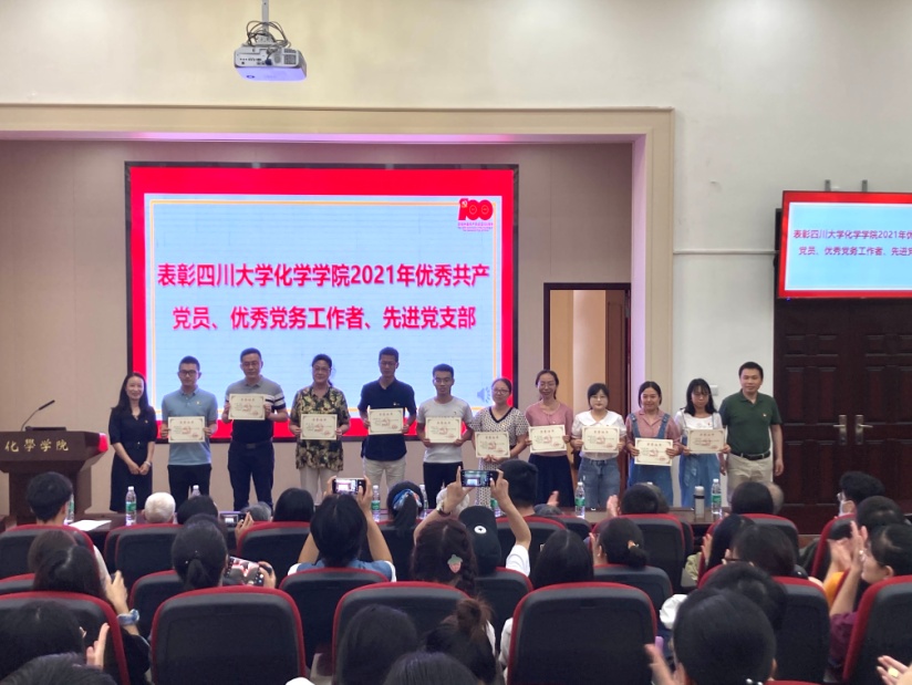 2021年7月1日15:00,英国正版365官方网站庆祝建党100周年专题党课暨“七一”表彰大会在化学馆321报告厅隆重举行。学院党政领导、党委委员、纪委委员、专职组织员、支部书记及支委、民主党派代表、离退休党员代表、在职教师党员代表、学生党员代表及全体预备党员参加了本次大会。大会由院党委书记谢均同志主持,大会在齐唱《中华人民共和国国歌》声中拉开帷幕。