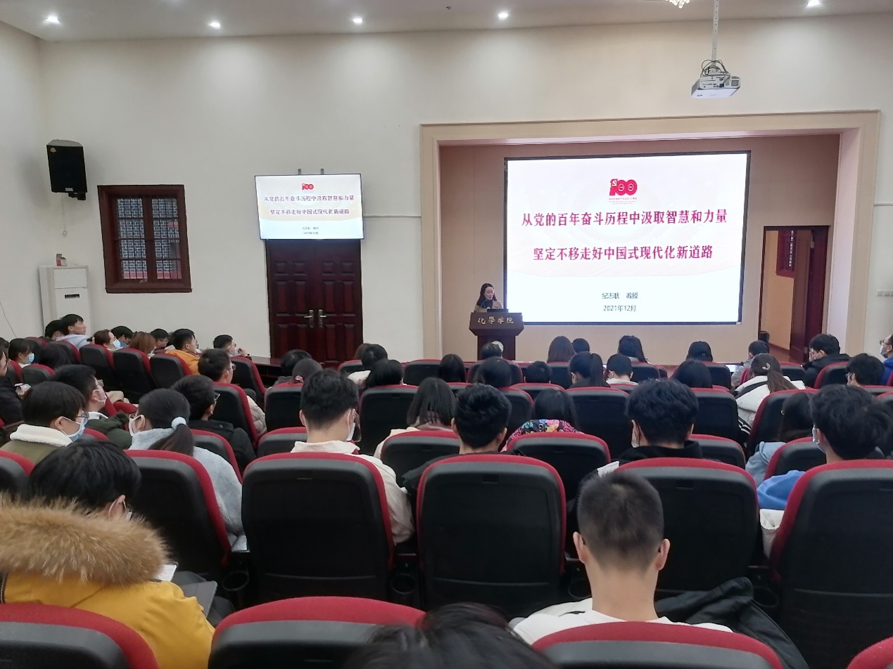 2021年12月17日下午,英国正版365官方网站学习党的十九届六中全会精神宣讲会在化学馆321报告厅举行。学院邀请到四川大学“党的十九届六中全会”宣讲团专家、四川大学宣传部副部长纪志耿教授做专题宣讲。学院党政班子成员、党委委员、纪委委员、各支部书记及委员、部分教职工和学生等160余人参加了此次宣讲报告会。宣讲会由学院党委书记谢均主持。