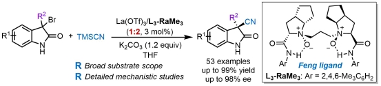 Zeng, Z.#; Yang, L. Q. #; Xiao, Z. J.; Chen, L.; Zhong, Z. W.; Wang, F.; Liu, X. H.; Dong, S. X.*; Feng, X. M.* A Remarkable Influence of La(III)/N,N'‑Dioxide Structure on Asymmetric Formal Substitution of 3‑Bromo-3-substituted Oxindoles with TMSCN, ACS Catal. 2024, 14, 2908.