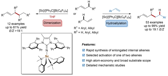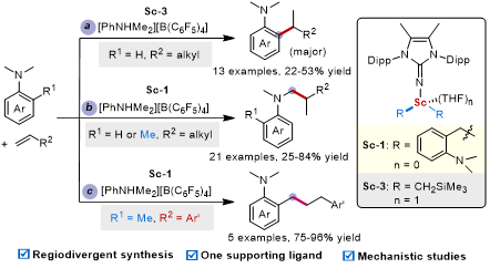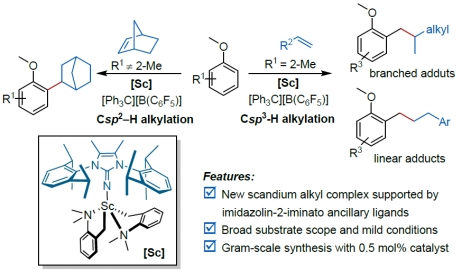 Wang. S. Y.; Zhu, C. H.; Ning, L. C.; Li, D. W.; Feng, X. M; Dong, S. X.* Regioselective C-H alkylation of anisoles with olefins by cationic imidazolin-2-iminato scandium(III) alkyl complexes, Chem. Sci. 2023, 14. 3132 (cover picture).